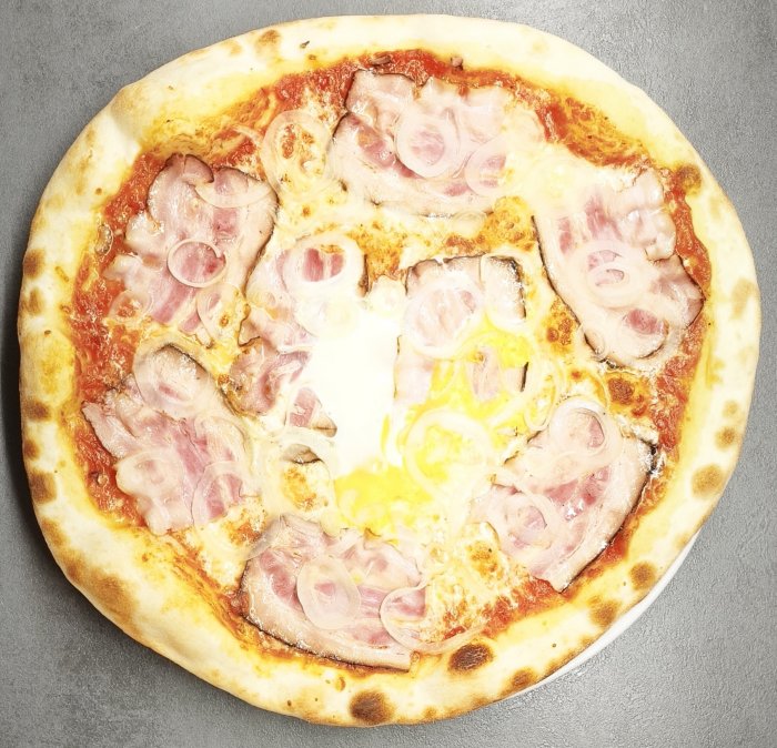 pomodoro, mozzarella, šunka, slanina, cibule,zakysaná smetana