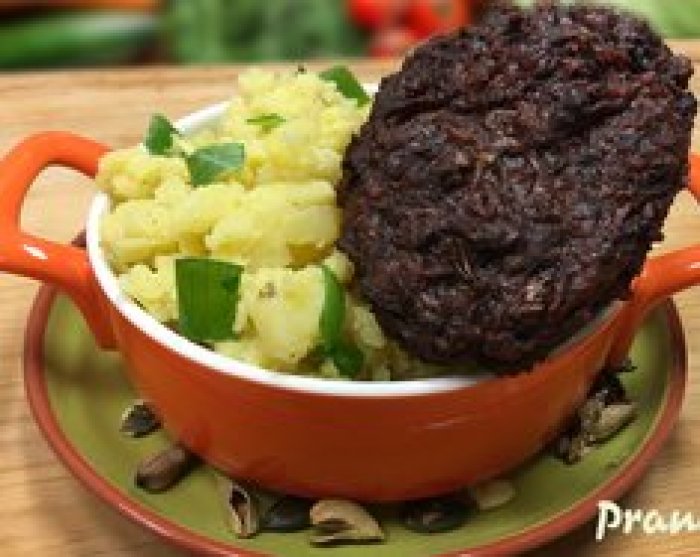 Kálí burger (1,10) V, šťouchané brambory s pórkem