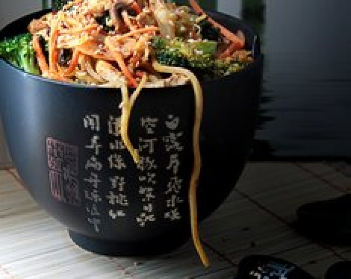 Smažené čínské nudle se zeleninou, tofu a sezamovým semínkem